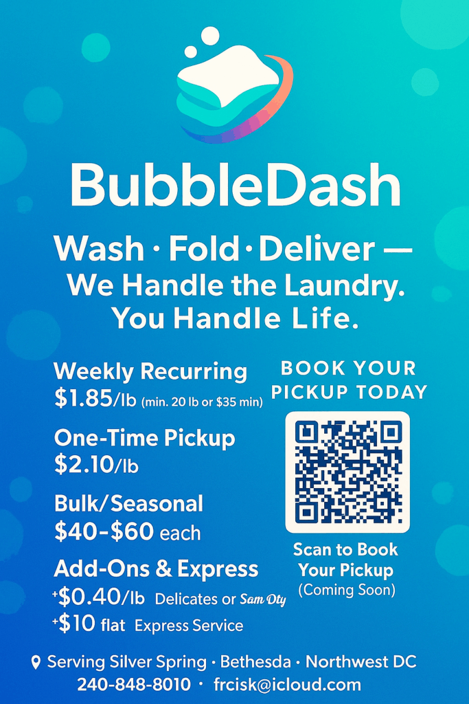 Life gets busy — laundry shouldn’t add to the stress. BubbleDash is a family-founded pickup and delivery laundry service based in Silver Spring, MD, built to give you back your time and peace of mind. We professionally wash, fold, and deliver fresh clothes right to your doorstep, so you can enjoy your day while we handle the laundry.